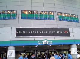 | 着席したのは開演1時間前。本当にこんなに人が入るのかと思うほど、客席はまばらだった。 時間が進むにつれ密度が高くなり、親子連れ、カップル、妊婦さん、友人同士。半分・・・まではいかないと思うけれど、男性も多い。 前の2席と、左隣2席が空席で、”まだ来ないのかなぁ” と心配しながら、会場を見渡す。 これ、ライトがあたると綺麗なんだよなぁ・・・。横断幕もウチワも、ペンライトも1つもなくって、それがまた照明の効果をあげている。 6時には、前も隣もやって来た。何だか一安心。あたりを見る限りでは満席だ。 「お待たせしました。ミスターチルドレン ドームツアー2005・・・」 そのアナウンスで、キャー。 次に照明がおちて、キャー。 舞台にミスチルメンバー、サポートメンバーが入ってきたのか、すぐまた歓声。 イントロが流れ、桜井さんが歌い始めると、また”キャー”。 1曲目は、そう。 「LOVE はじめました」 意外な選曲に、客席がまた騒ぐ。 ・・・そう来たか、桜井! 「アイ ラブ ユー」 だものね。”LOVEはじ” が来るのも予想は出来たはず。なのに、当てられなかった。ギターをかき鳴らし、”これだったんだよ・・・!” って、あの瞳で、笑いながら歌っているかも。 続いてエレキギターのイントロで 「Dance Dance Dance」! ちょっと懐かしい。私が初めて観たビデオ、それも東京ドームだった・・・に入ってたっけ。 ここでまた予想外の出来事。花火。♪満たされた〜バーン! うわぁ〜〜と声が上がった。 次は、「ニシエヒガシエ」。前回のこの曲では、”こわ〜い・・・” という演出だったが、今日はベーシックに歌っていた。 桜井 「こんばんはー! ミスターチルドレンです」 深々とおじぎをする。 桜井 「照明さん・・・上のほう(2階席・3階席)も照らしてください。はい・・・」 2階、3階にもライトがつく。 お客さんを確認するかのように見上げ、MCに戻る。ここまででもう、ステージを走り回っていて、でも疲れた様子はない。深めのブルーのボタンシャツ。その下は、黒いタンクトップ、だろうか。 そしていよいよツアーアイラブユー! 「跳べ」。 この曲でも、走る走る! ハンドマイクで歌う。走りながら、両腕を翼のように広げる。 どの曲からだったか忘れてしまったけれど、上に羽織っていたシャツを脱ぎ捨て、黒のタンクトップだけになった。ちょっとドキッとした。・・・こんな遠くから観てるのに。 そして 「イノセントワールド」。いつものように皆、歌う。時折マイクを客席に預けながら、桜井さんも歌う。いつごろからなのかな、皆でこの歌を歌うようになったのは・・・。 スクリーンに客席が映し出されれば、そこにタッチしながら。 野外で雨が降れば、両腕を広げて。 桜井さんは歌い終えると、ステージ中央で深々とおじぎをした。アコースティックギターを持ち、上着を羽織る。 桜井 「かっこいいーーって言って!」 客席 「かっこいいーー!!」 とお客さんと掛け合いをしながらのMC。 桜井 「ステキーーって言って! ・・・でも言ってもらいたい言葉なんてホントは何にも無いんですけど」 なんて言いつつ、曲は、「言わせてみてぇもんだ」。 演奏が終わると、また話してくれた。 桜井 「次の曲は・・・呼びかけの曲なんですけど、 ♪ヘイ ジュード〜 とか言おうと思ったんですが・・・やめました。 えー、ステージ上でもこうやっていろいろ迷っているわけですよ。 これは自分たちの音楽に対する、姿勢を歌ってるんじゃないかと最近思います。では・・・」 「くるみ」 がアコースティックギター1本で始まった。何度も何度も、”くるみ” の部分を繰り返す。 「CANDY」 「靴ひも」 「隔たり」 と、アルバムナンバーが続く。 ドーム、ということで、音響面は期待していなかったけれど、思ったよりもずっと音がきれい。それに桜井さんの声もよく出ていた。 次は 「ファスナー」。 スクリーンには、ファスナーが次々に開き、いろんな景色、物が出てくる様子が映し出された。 そして 「モンスター」。 ステージ後方に、ロボットのような宇宙人のような巨大コンピューターのような、奇妙なものが現れ、顔の部分が円いスクリーンになっている。出てきた瞬間、うわっ、と驚き、ジーっと見入ってしまった。時々、一瞬、牙をむいた怪獣が映る。 ”Knock Knock!” では、もちろん腕を振り上げる。 私の周辺では実現しなかったが、「さあ どんな叫び声をあげようか?」 のすぐあとは、「キャー! ギャー!!」 と叫ぶつもりだった。 そして 「ランニングハイ」。 タイトルのごとく、走り回る桜井さん。スクリーンに映った姿も見つつ、走る彼を目で追う。本当によく走る。走っている曲のほうが多いのではないかと思ってしまう。 桜井 「えー・・・タイトル通り、走ってますが、ステージは、端から端まで100mあるんですが、 年々この距離が長くなっているような。本当は、もっとぐる〜〜っと1周したいです。 ・・・今日は、そこ(桜井さん左手)の はじ 