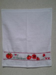 ◆1月12日の、トマトの正体です(笑)。 クロスステッチ用の布に刺繍したものを、ハンドタオルに縫いつけました。 手芸店で、「あっ、トマトだ!」。 クロスステッチなら出来ると思い、購入。 刺繍レシピには勿論、”Mr.Children” と載っていたのではなく、飾り文字で ”TOMATO” でした。 「トマトじゃなぁ〜・・そのまんまだし」 レシピのデザインを少々変えて作った、非公式グッズ(??)です。 ◆STITCH TAPE KIT ¥880 <COSMO> (刺繍糸、タオル、ステッチテープ、図案) ”アルファベット図案付” 飾り文字の図案ではなかった! |